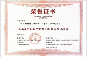 大赛旨在丰富MTI教学的多样性,汇聚不同高校的翻译硕士专业在MTI教学过程中积累的经验做法,同时为各类学校的MTI课程提供具有实践指导意义的教学案例。我院依托河南省知识产权外译研究中心,聚焦知识产权外译研究与实践,深挖地理标志外译素材和案例,由姚晓鸣、贺红艳教师,MTI研究生刘豪洋、田泽瑞组成的团队以“AI+口译模拟项目:河南省地标产品国际推介会”为题的参赛案例荣获全国口译组二等奖;关成勇与MTI研究生白雨晨、李巧丽、杨晨斌团队以“探索‘四大怀药’译后编辑 讲好中国地标故事”为题的参赛案例荣获全国笔译组三等奖。在2025 MTI案例教学研讨会暨“第二届 MTI教学案例大赛”颁奖典礼平行论坛上,贺红艳代表团队的主旨发言,获得与会专家的一致好评。