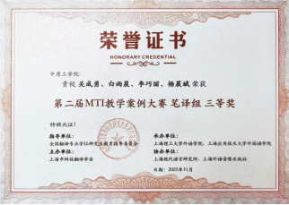 11月1日,第二届全国MTI教学案例大赛颁奖典礼在上海应用技术大学举行。大赛由全国翻译专业学位研究生教育指导委员会指导,上海市科技翻译协会主办,上海理工大学外语学院和上海应用技术大学外国语学院承办,共设笔译、口译、翻译技术、翻译项目管理四个组别。经过多轮专家评审,我院师生两个团队从全国227个参赛队中脱颖而出,荣获全国口译组二等奖1项,笔译组三等奖1项。