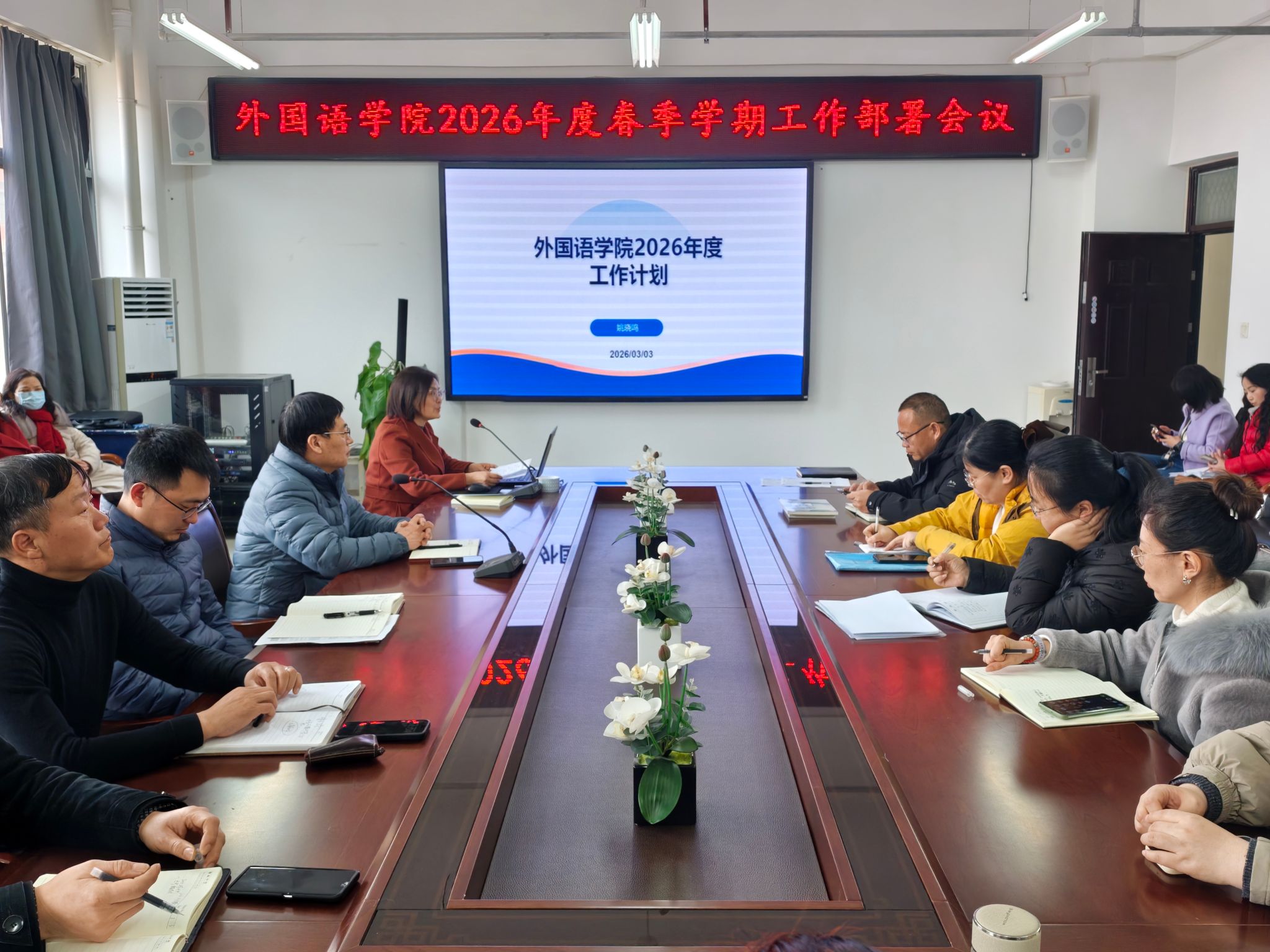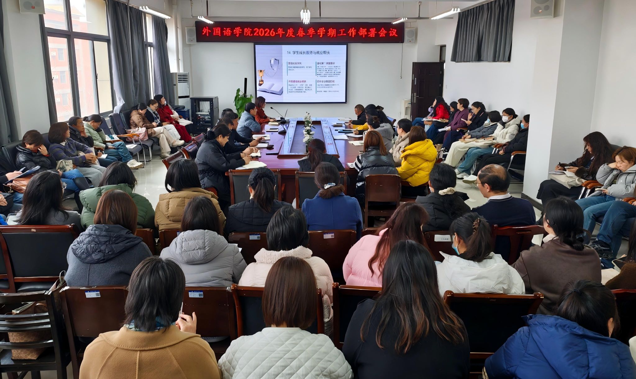 会上,院长姚晓鸣代表学院简要回顾了寒假期间各项工作进展与成绩,客观分析了当前外语学科发展面临的新形势、新机遇与新挑战,并从六大维度作出系统部署:一是坚持政治铸魂,强化党建引领与强基固本根基;二是谋划“十五五”新蓝图,推动事业高质量发展;三是落实立德树人,推动人才培养质量提档升级;四是聚焦学科交叉,推动产教融合科教融汇落地见实效;五是坚持引育并举,推动高水平师资队伍建设;六是做好规章制度“废改立新”,推动内部治理提质,全面推动学院事业迈上新台阶。
