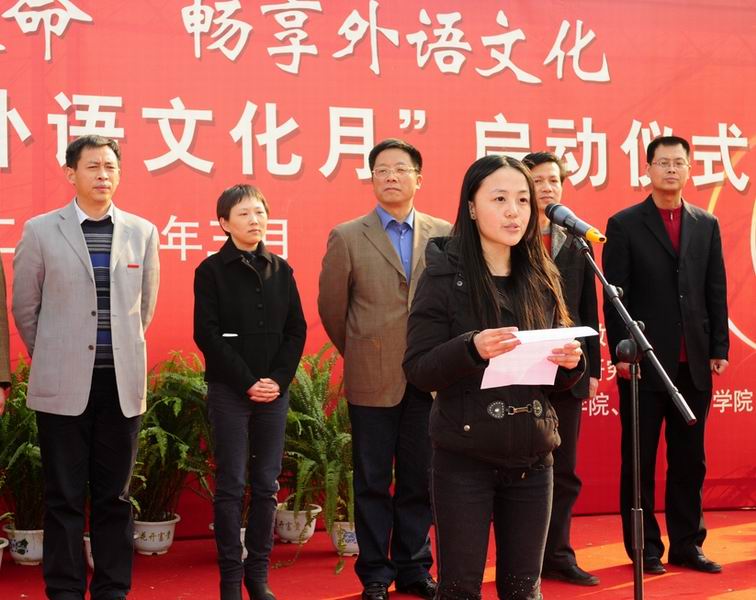 3月30日下午,我校首届“外语文化月”启动仪式在滴水涌泉广场隆重举行。校党委副书记刘志刚,副院长曹健、学生处、就业处处长张东伟、教务处处长李惠杰、研究生处处长方润生、团委书记孙斌、外国语学院院长郭万群、国际教育学院院长刘跃军、部分学院副书记、团总支书记、辅导员和400余名学生代表参加了本次启动仪式。