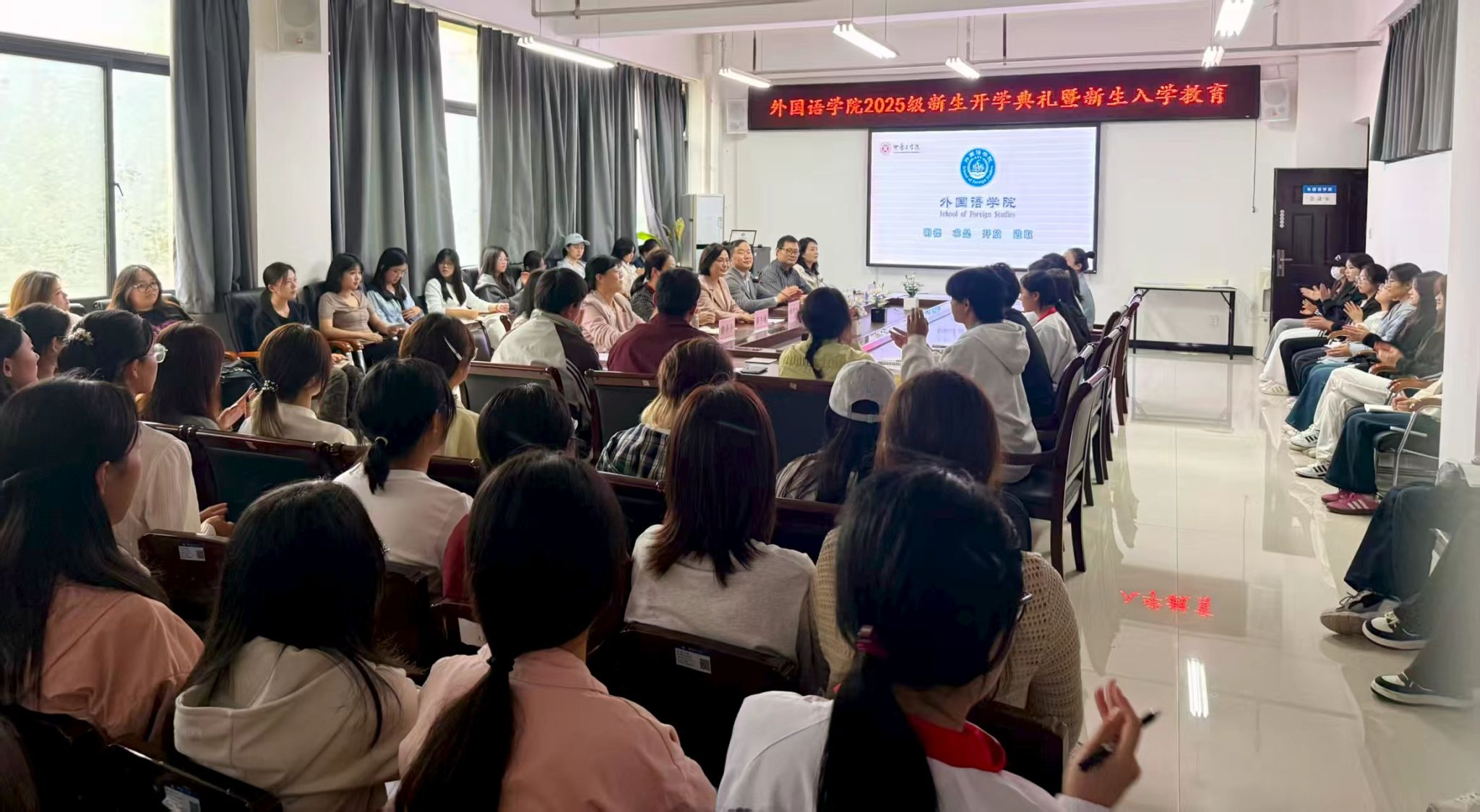 9月28日下午,我院2025年本科新生开学典礼在3号组团楼402会议室举行。学院领导班子成员、各专业系部主任、新生辅导员、班主任及2025级全体本科学生出席会议。
