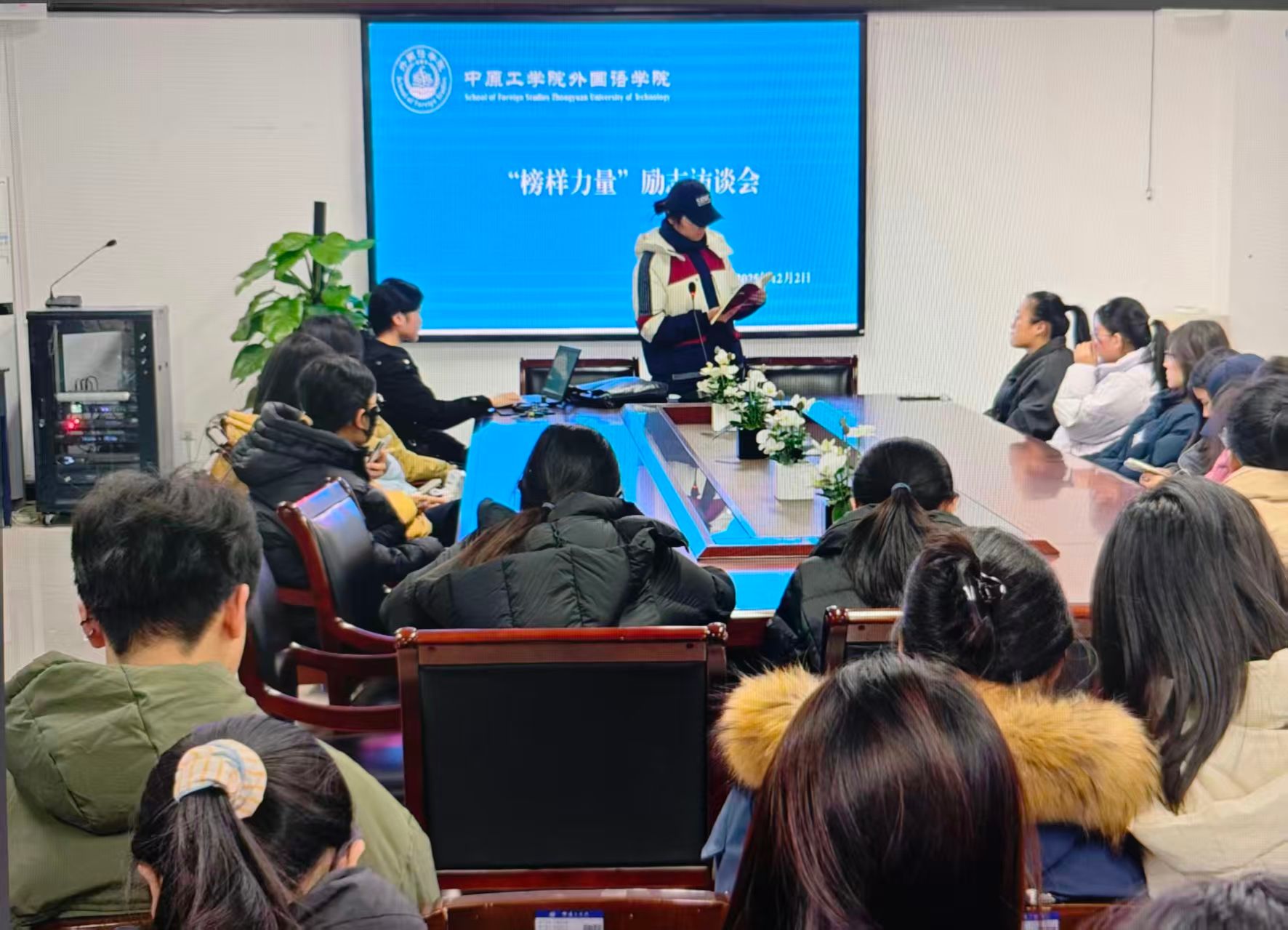 2025年12月2日晚,外国语学院在三号组团楼A401会议室举办“榜样力量”励志访谈会。活动以“聆听榜样故事,汲取奋进力量”为主题,面向2025级全体新生开展,通过身边榜样的真实分享,激励学生明确方向、踏实前行。